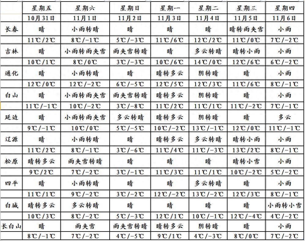 全省晴转多云,吉林、通化中北部、白山、延边中西部、长白山保护开发区有雨夹雪转小雪,白城东部、松原、长春、四平、辽源有小雨或雨夹雪。
