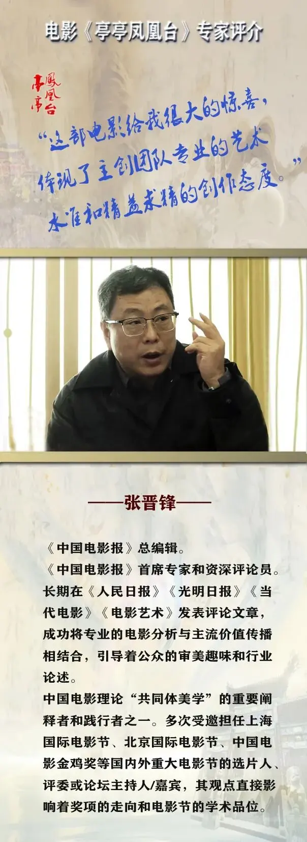 《亭亭凤凰台》给我很大的惊喜。首先电影让我长了见识,知道了这个千年古县有悠久的历史,灿烂的文化和深厚的人文底蕴。第二个惊喜就是这个故事没有表现乡村振兴、脱贫攻坚、党员带领大家致富、直播带货,仅这一点就已经超越了全国80%的电影。第三个惊喜是讲故事的方式和能力又前进了一大步。《亭亭凤凰台》采用的多时空叙事加上一个贯穿始终的悬念设置非常难得,电影里有喜剧、悬疑、爱情。从情感上来讲,亲情、爱情、友情、乡情和家国情怀,它的内涵非常丰富。第四个惊喜就是把我们优秀的传统文化、历史文化和地方特色元素融进了故事中,粗陶、酒文化、西狭颂、杜甫草堂等等,这些元素整体上我觉得完成得都很好,体现了主创团队专业的艺术水准和精益求精的创作态度。