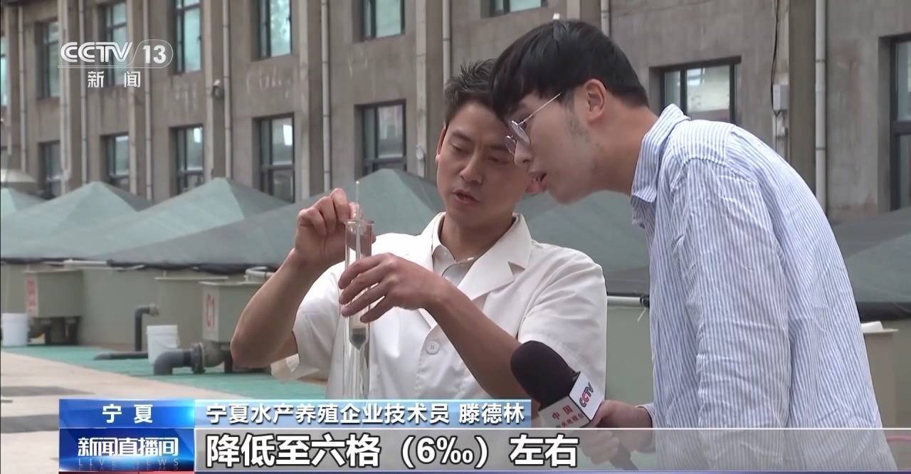 宁夏水产养殖企业技术员 滕德林:池子边上有刻度,先把淡水加到一定的水位线,再加盐卤水。经过淡水把盐水稀释降低至六格(6‰)左右,达到南美白对虾最适应的盐度,让养出的虾品质更鲜甜。